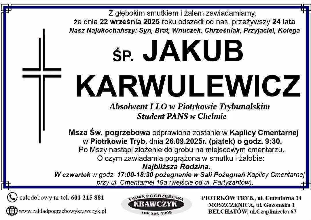 Z ogromnym smutkiem przyjęliśmy wiadomość o śmierci naszego Kolegi, śp. Jakuba Karwulewicza, studenta PANS w Chełmie. W tych trudnych chwilach składamy Rodzinie, Bliskim oraz Przyjaciołom wyrazy głębokiego współczucia i szczere kondolencje. Na zawsze pozostanie w naszej pamięci jako ciepła, życzliwa i pełna energii osoba.